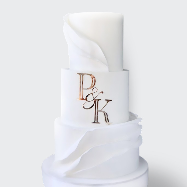 0 Свадебный торт белый с золотыми инициалами и драпировкой 3 яруса № 545