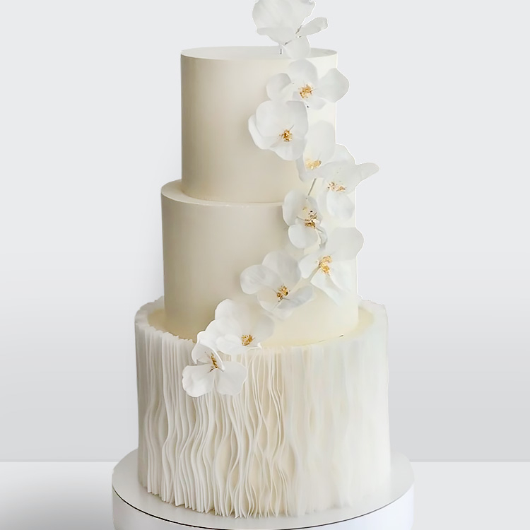 Свадебный торт белый 3 яруса с белыми цветами и оборкой из рисовой бумаги № 548