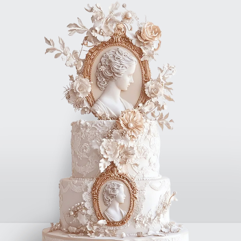 Свадебный торт винтажный с цветами, золотыми узорами и барельефом девушки № 585