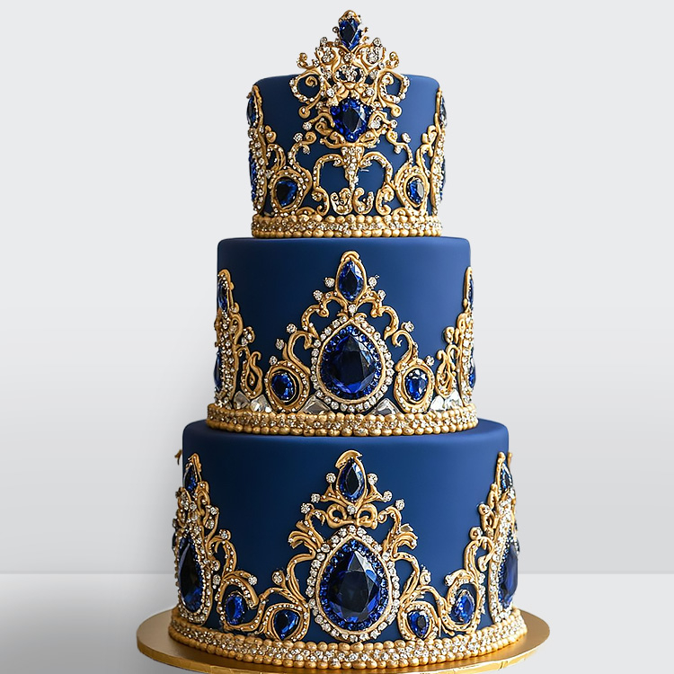 0 Свадебный торт синий с золотыми узорами и синими камнями царский 3 яруса № 595