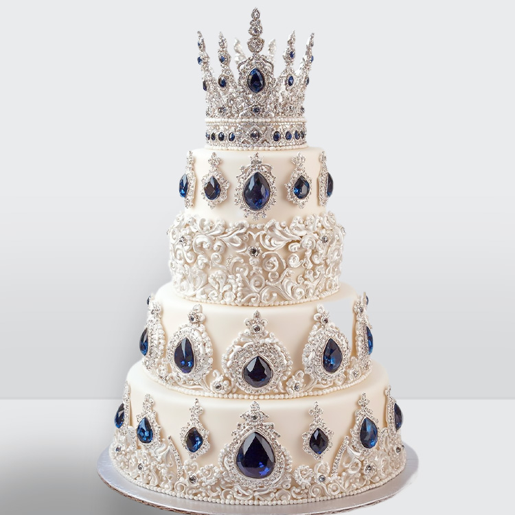 0 Свадебный торт в стиле ампир с короной в серебре и синими камнями 4 яруса № 596