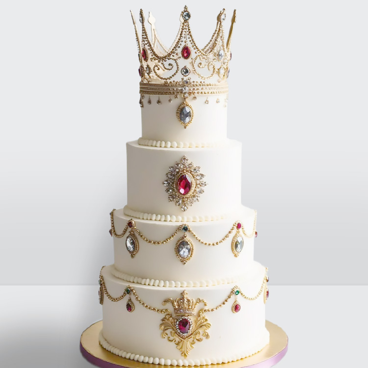 0 Свадебный торт с золотой короной камнями и нитями жемчуга 4 яруса № 597