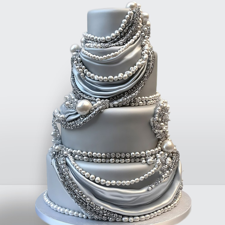 0 Свадебный торт серебряный с драпировкой и нитями жемчуга 4 яруса № 602