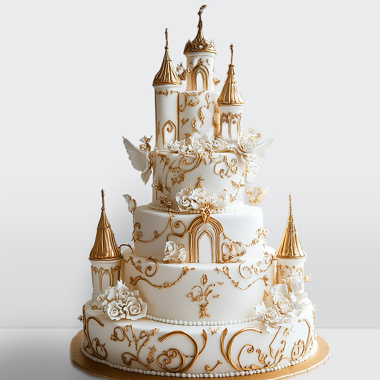 0 Свадебный торт сказочный в виде замка с золотыми узорами 5 ярусов № 612