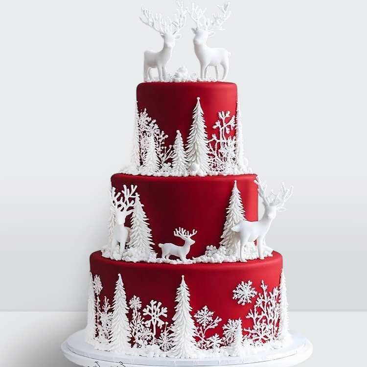 0 Торт красный зимний со снежинками с елочками и оленями 3 яруса № 620
