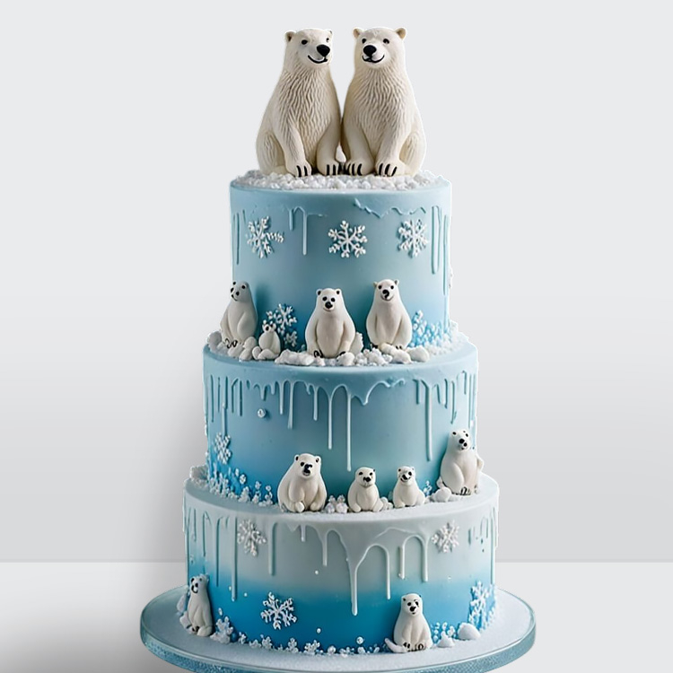 0 Торт голубой зимний со снежинками и белыми медведями 3 яруса № 628