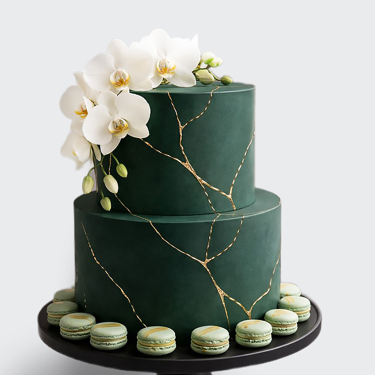 0 Торт зеленый в стиле минимализм 3 яруса с орхидеями и золотом и макарун № 649