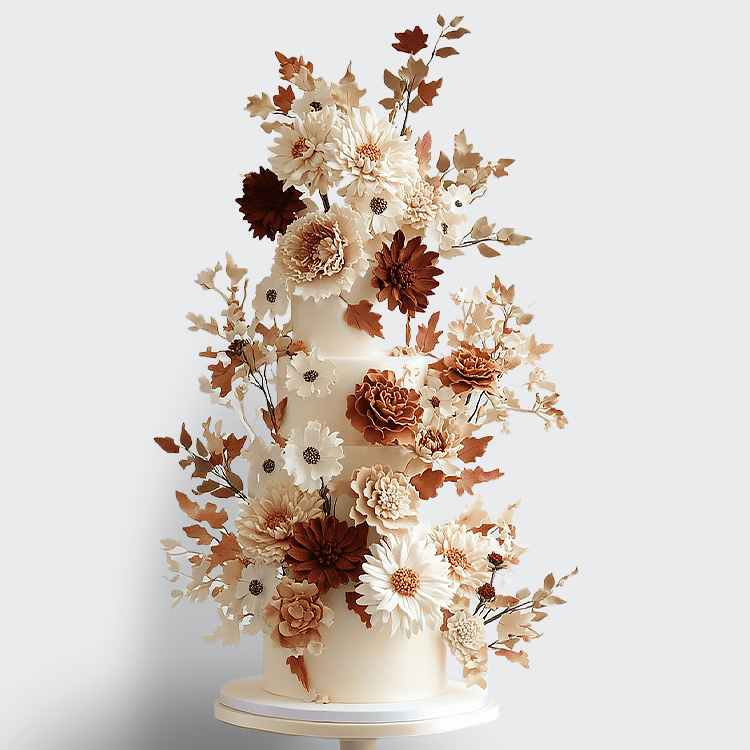0 Торт осенний 4 яруса с листьями и цветами цвета охра № 656