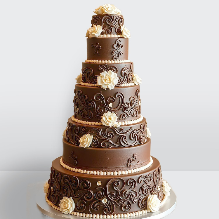 0 Торт шоколадный 7 ярусов украшенный белыми цветами с узорами и бусинами № 666