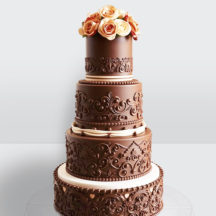 0 Торт 4 яруса украшенный розами и шоколадными узорами с бусинами № 669