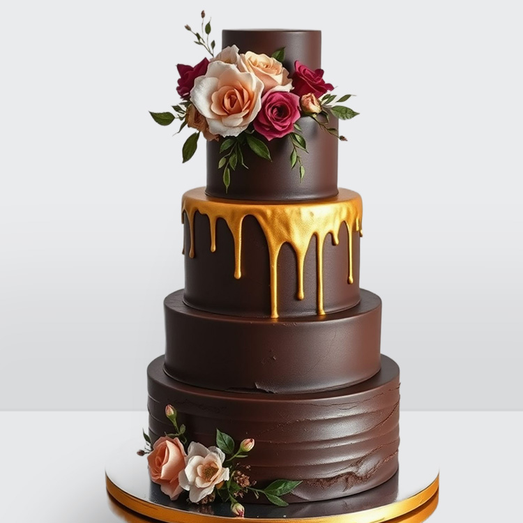 0 Торт шоколадный 4 яруса облитый шоколадом золотом украшенный розами № 676