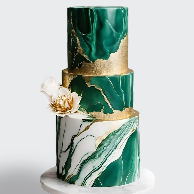 0 Торт под мрамор 3 яруса в стиле минимализм зеленый с золотом и розами № 686
