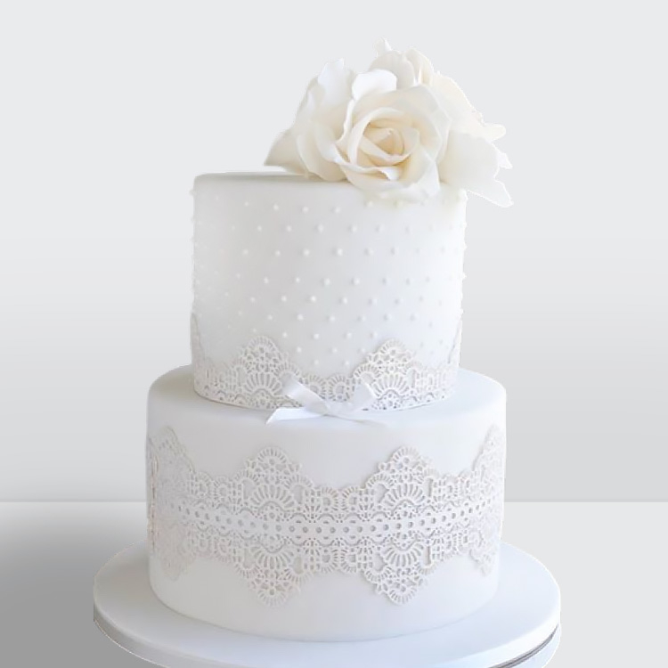 0 Торт 2 яруса белый украшенный кружевом лентами и розами № 715