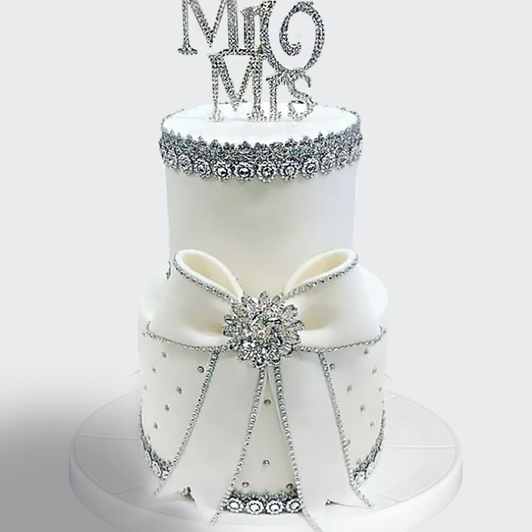 0 Торт 2 яруса белый украшенный инициалами большим бантом и кристаллами № 719