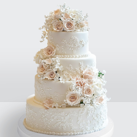 0 Торт 4 яруса с кружевом и чайными розами № 767