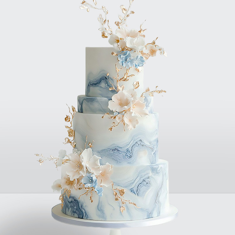 0 Торт 4 яруса голубой мраморный с золотыми цветами № 781