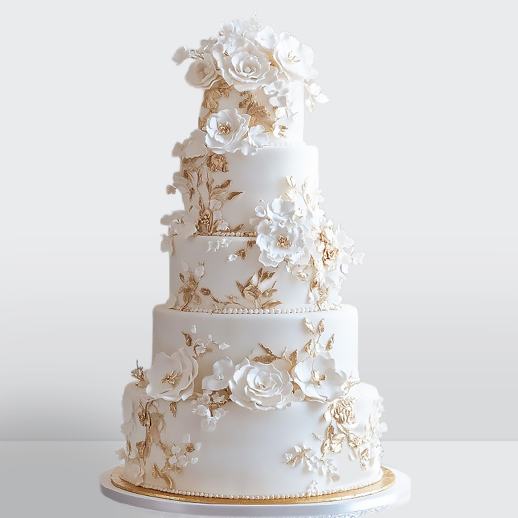 0 Торт 5 ярусов с золотом и цветами на свадьбу № 794