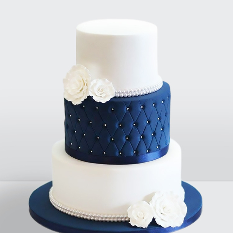 Торт 3 яруса синий, велюровый с жемчужинами и цветами № 809
