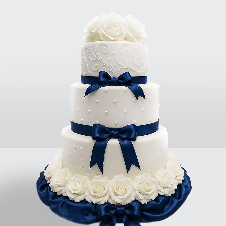 0 Торт 3 яруса с орнаментом, синими лентами и бантами, с розами и бусинами № 810
