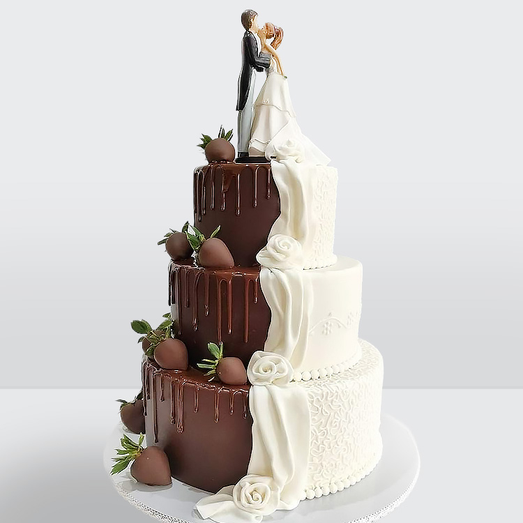 0 Торт 3 яруса шоколадный с клубникой и с фигурками жениха и невесты № 824