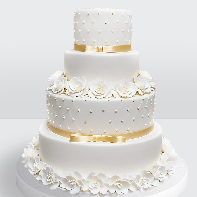 0 Торт 4 яруса с золотыми лентами, бусинами и цветами № 831