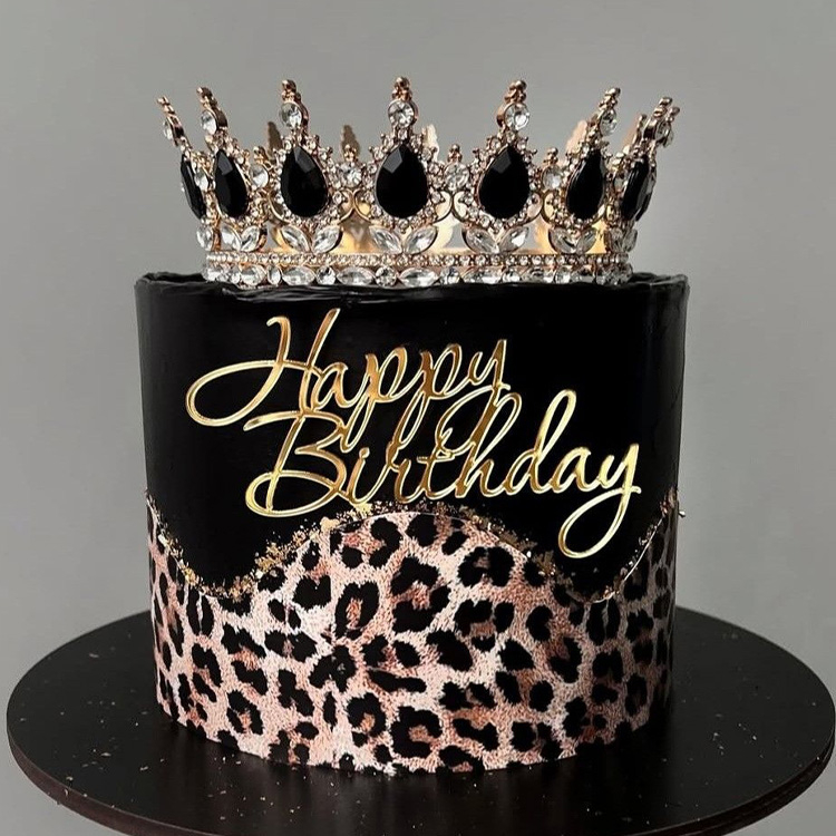 Торт черный леопардовый с золотой короной с черными камнями и надписью с эффектным декором и стильной композицией № 857