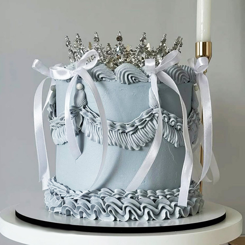 Торт голубой в стиле ламбет с серебряной короной и лентами с изящным декором и праздничной композицией № 862