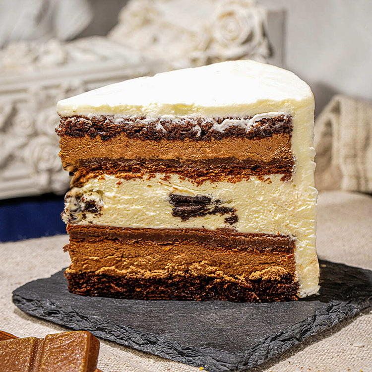 Два вида бисквита: сочный классический с добавлением какао и бисквит на основе чёрного шоколада без муки, шоколадный крем на основе чёрного шоколада, шоколадный мусс на основе белого шоколада и печенье “Орео”