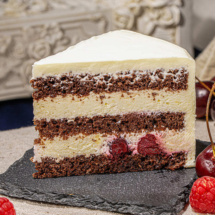 Шоколадный бисквит пропитанный вишневым сиропом, ванильный крем и маринованная вишня.
