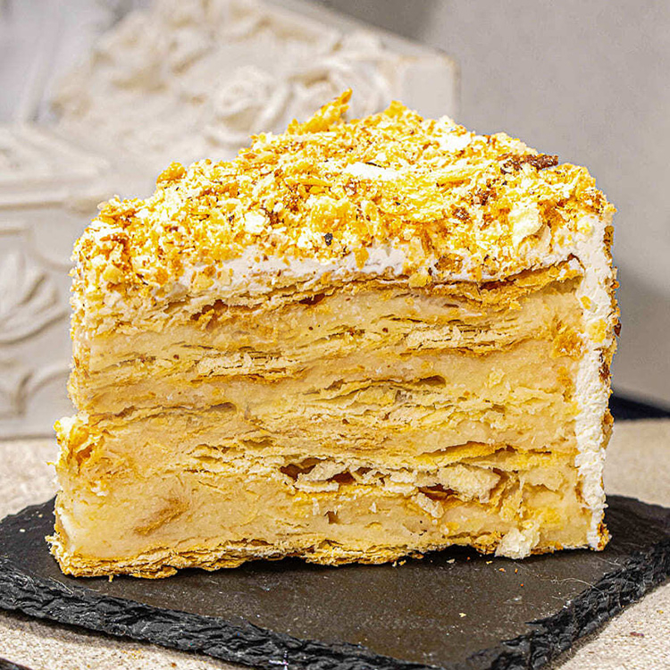 Ванильные хрустящие слоеные коржи, на основе сливочного масла 82%, прослаиваются нежным, классическим, заварным кремом.