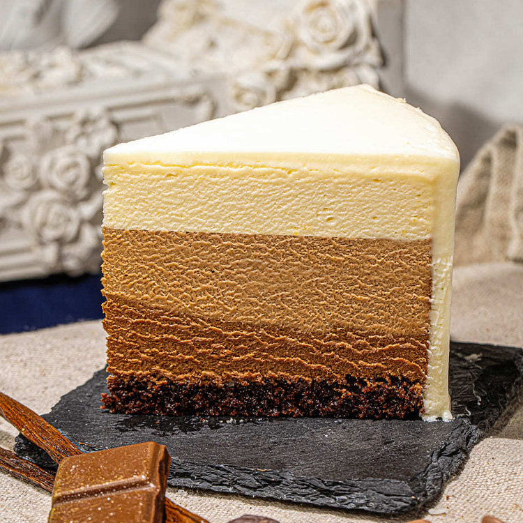 Один слой сочного шоколадного бисквита и 3 слоя нежного мусса на основе белого, молочного, черного бельгийского шоколада Callebaut- и натуральных сливок.