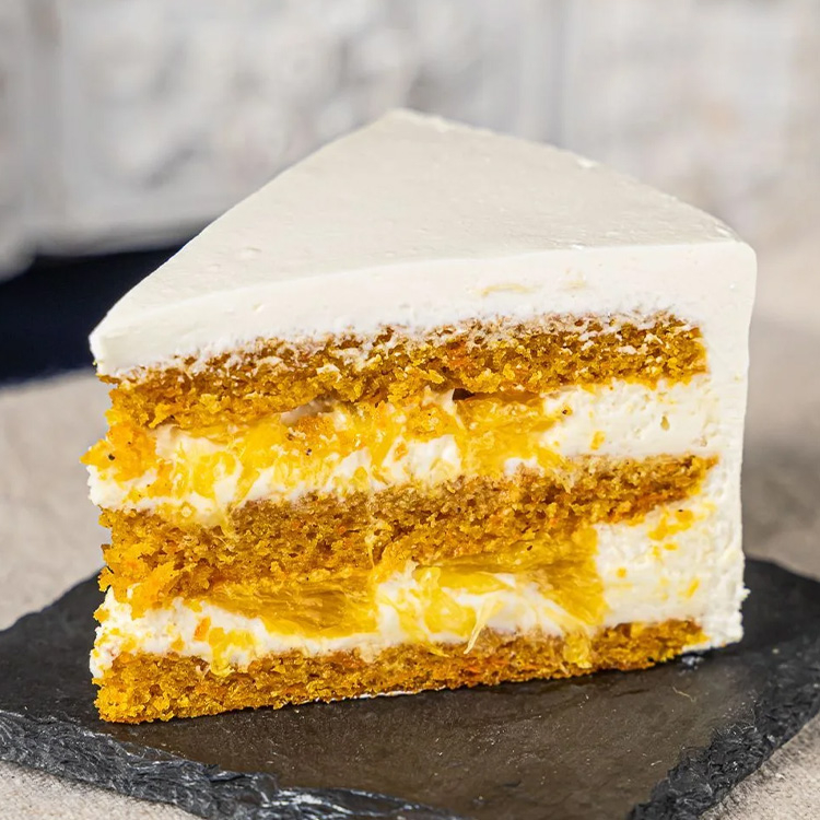 Сочный, пряный, ароматный бисквит с морковью, апельсиновой цедрой и пряностями прослаивается кремом на основе сыра «Маскарпоне», с добавлением кусочков апельсина маринованного в ликере «Grand Marnier».