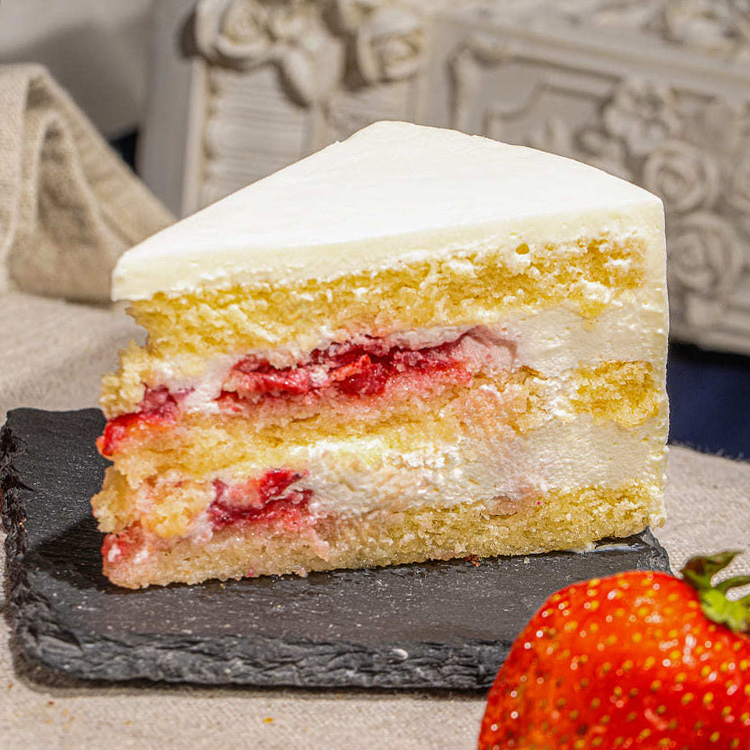 Нежный ванильный бисквит пропитывается сиропом и легким ванильным кремом на основе натуральных сливок. Крем варится по аналогии мороженого «Пломбир». В крем добавляются кусочки клубники