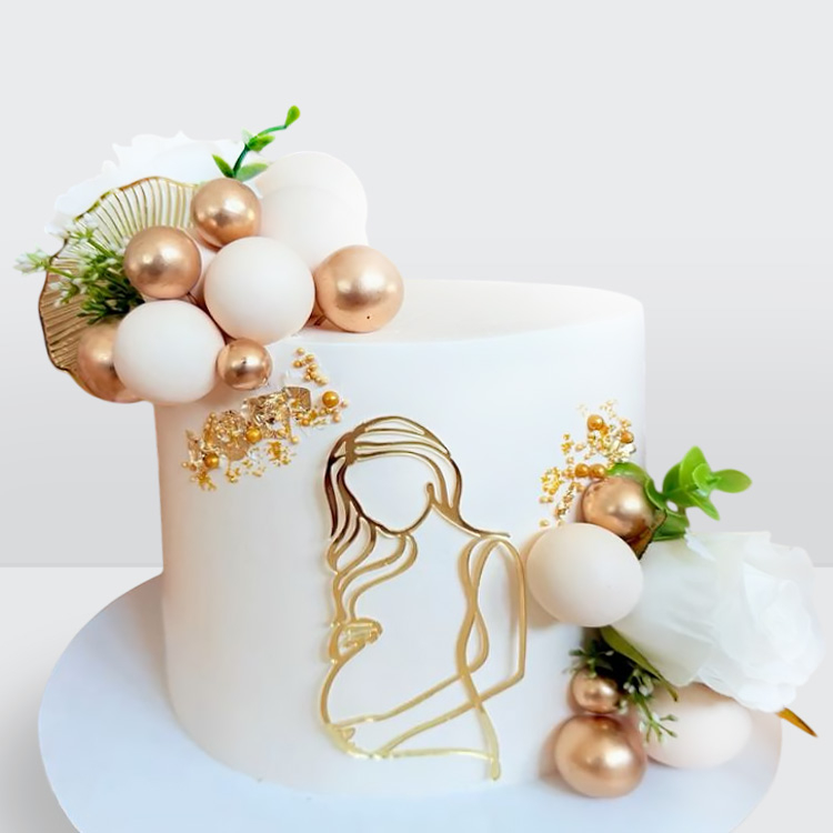 Торт для беременной с силуэтом цветами и золотыми шарами № 965