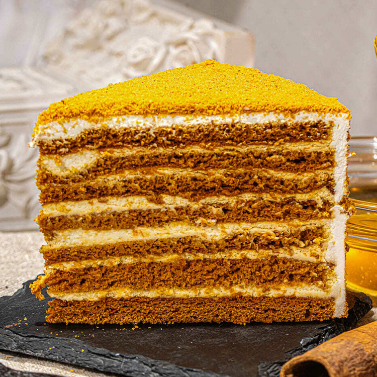 Яйца куриные, сахар-песок, мука пшеничная в/с, специи ванилин, масло сливочное 82,5, сода пищевая, мед натуральный, желатин, разрыхлитель, молоко пастеризованное 3,2%, сливки из коровьего молока 33%.